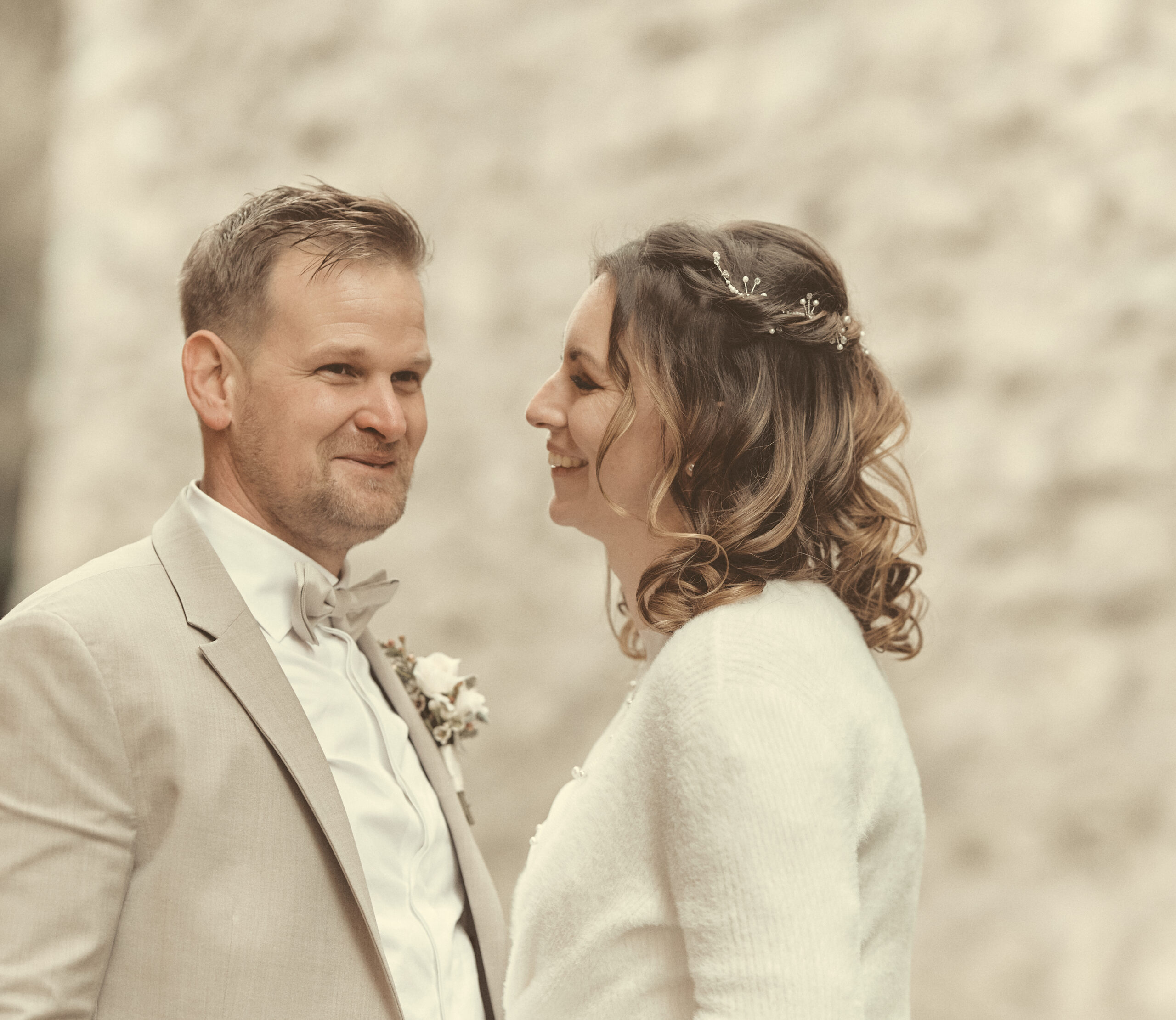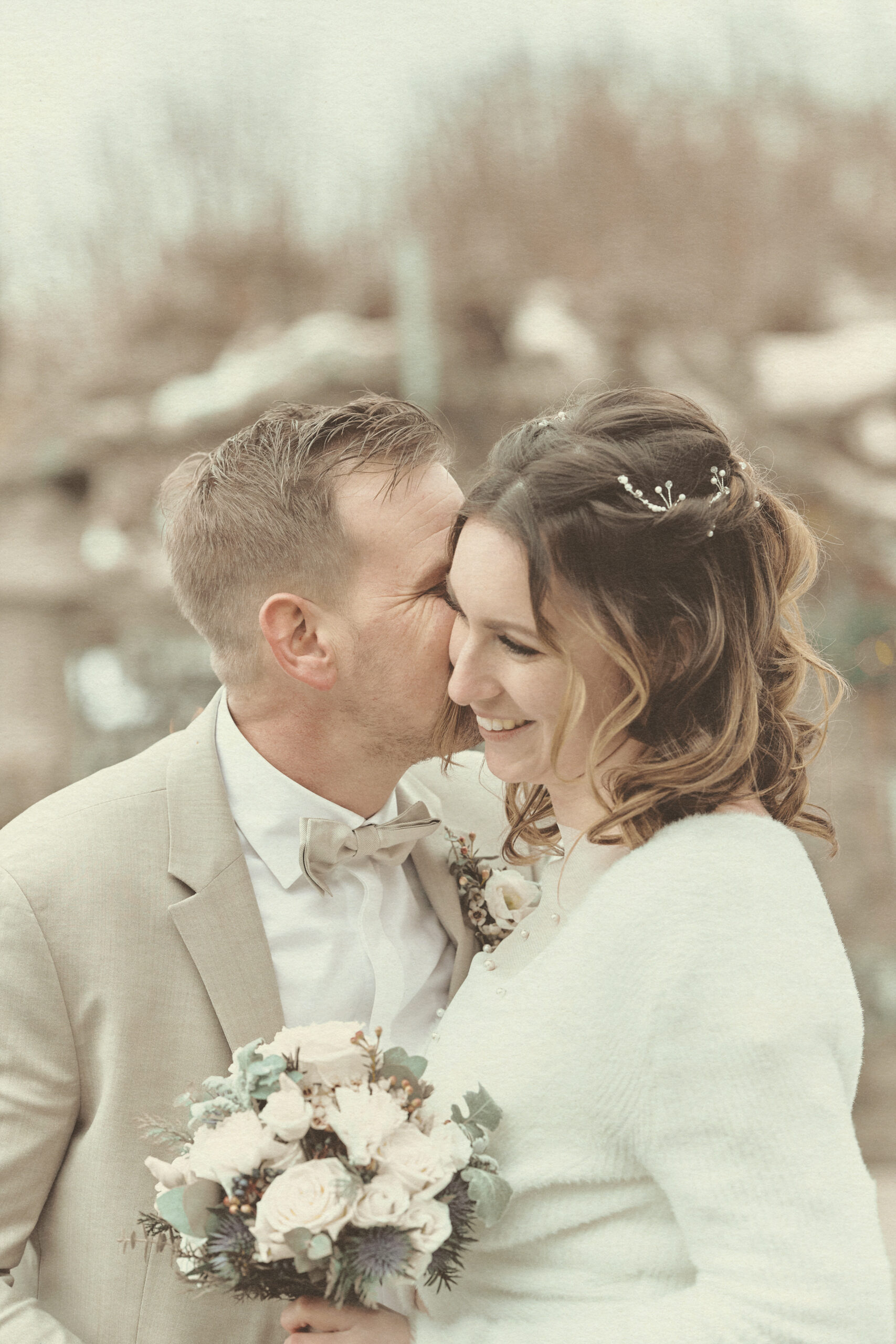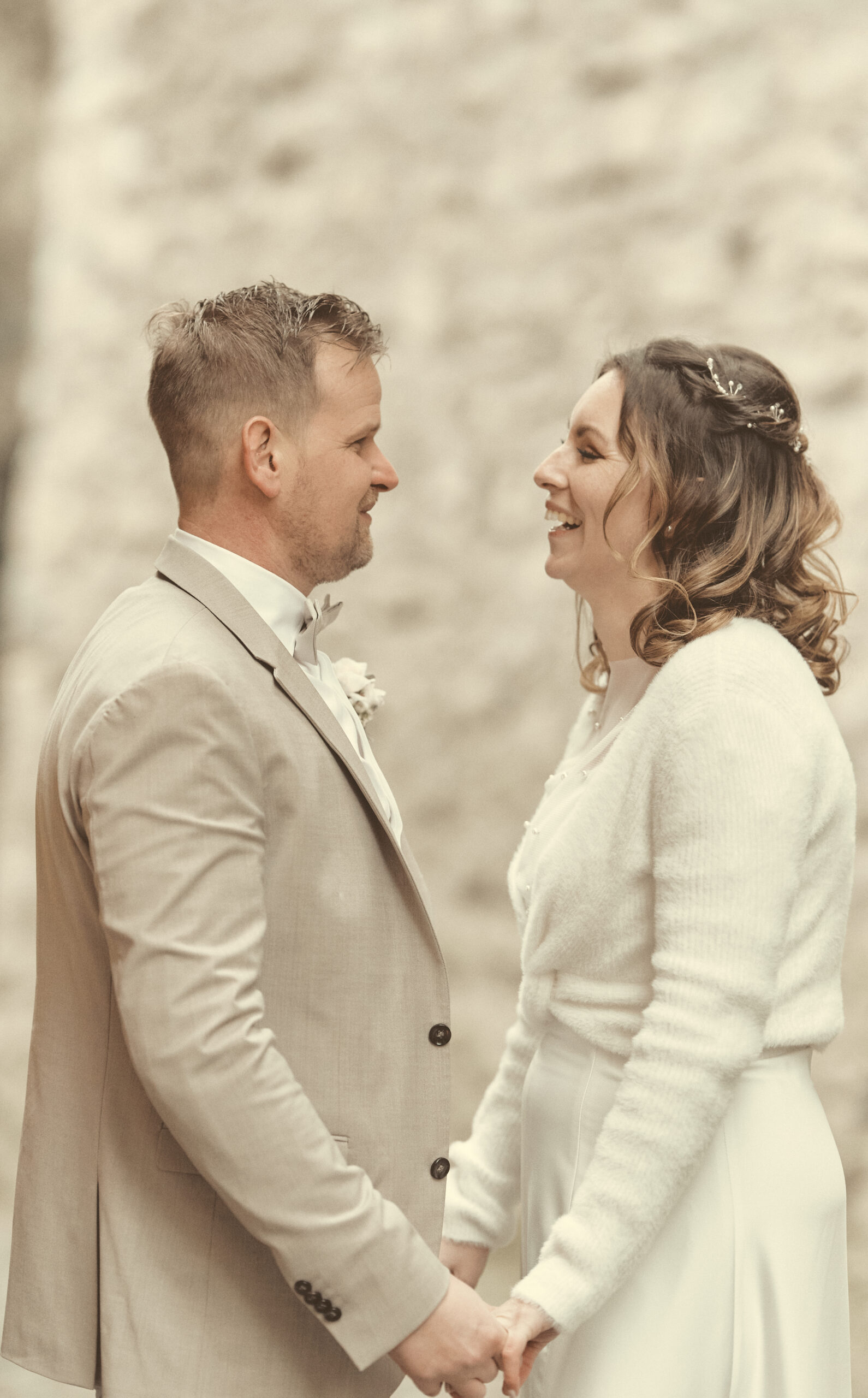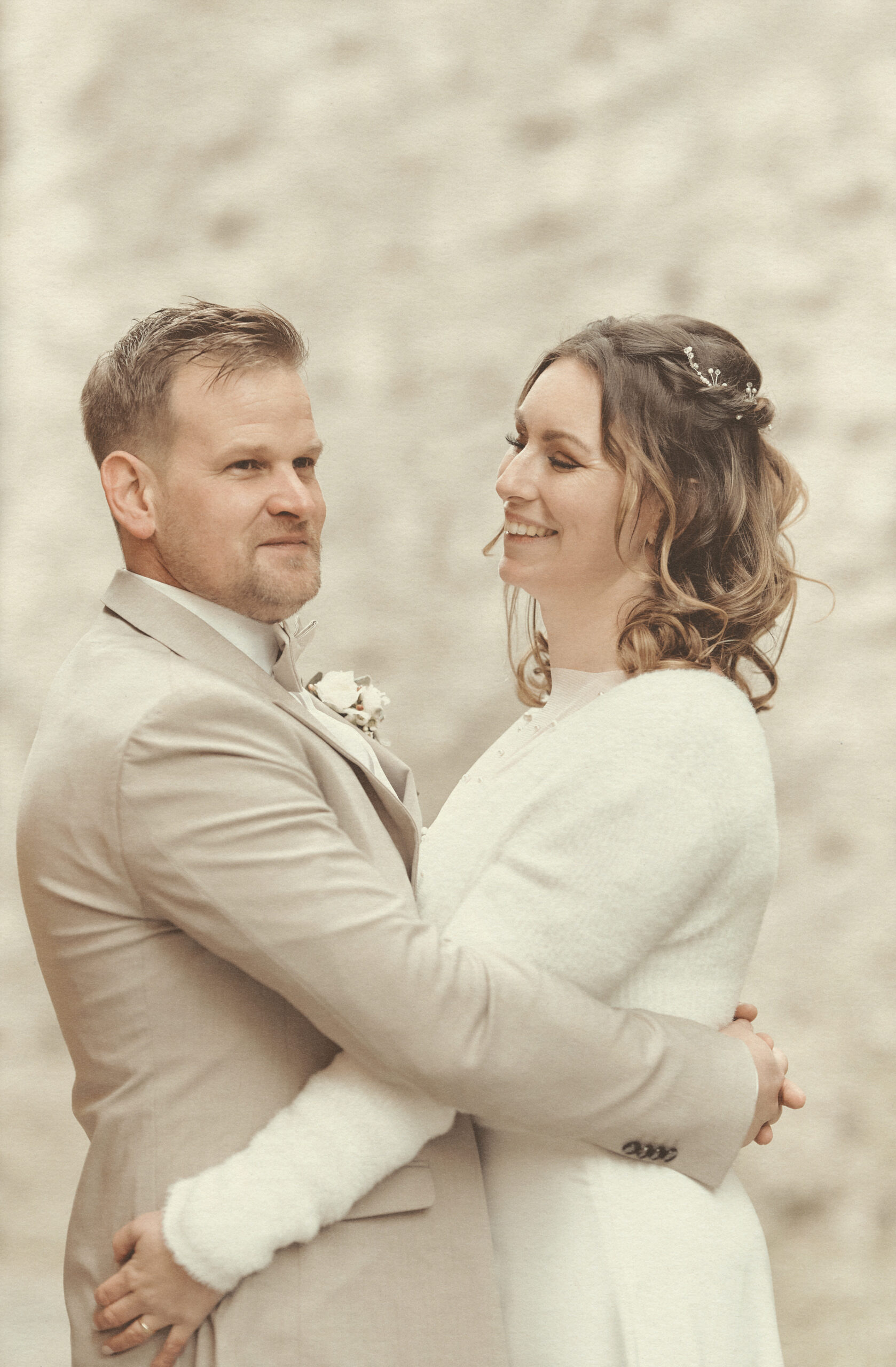 Jedes Detail wurde bewusst in einem edlen, cremig-matten Farbton gehalten, um die Natürlichkeit und Emotionen dieses Tages in einer zarten, harmonischen Bildsprache festzuhalten.